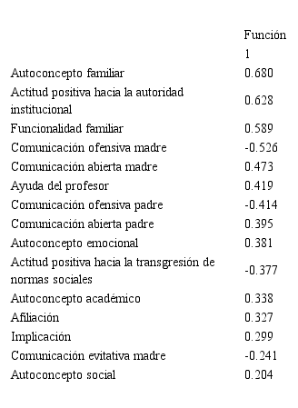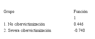 En la tabla 3 se observa la función y el centroide de cada grupo sobre la función discriminante y en la tabla 4 se muestra la matriz de estructura de la función discriminante con las variables ordenadas por su grado de saturación canónica. Se opta por considerar las saturaciones superiores a 0.20; se observa que las variables comunicación ofensiva de la madre, comunicación ofensiva del padre, actitud positiva hacia la transgresión de normas sociales y la comunicación evitativa de la madre presentan mayor saturación discriminante en el grupo de severa cibervictimización, mientras que los factores de autoconcepto familiar, actitud positiva hacia la autoridad institucional, funcionalidad familiar, comunicación abierta de la madre, ayuda del profesor, la comunicación abierta del padre, el autoconcepto emocional, el autoconcepto académico, afiliación e implicación escolar y el autoconcepto social presentan mayor saturación discriminante en el grupo de no-cibervictimización.