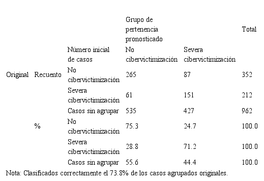 En la tabla 5 se presentan los resultados de clasificación de los grupos de severa y no cibervictimización, con la intención de percatarse del grado de predicción acertada; de ahí se subraya que predice el 73.8% de los casos. De esta manera, pronostica correctamente a los adolescentes no cibervictimizados en un 75.3% y en un 71.2% los de severa cibervictimización.