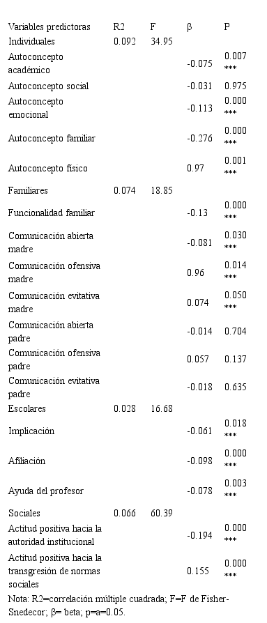 Se puede constar en la tabla 6 el análisis de regresión, confirmando el valor predictivo de las variables individuales al 9.2%, familiares al 7.74%, escolares al 2.8% y sociales al 6.6%. Las variables predictoras de cibervictimización estadísticamente significativas en la dimensión individual fueron el autoconcepto familiar, emocional, físico y académico. En cuanto a la dimensión familiar, la comunicación ofensiva, abierta y evitativa con la madre se reportaron estadísticamente significativas. En la dimensión escolar, la afiliación, ayuda del profesor y la implicación resultaron los predictores más importantes. En lo social, la actitud positiva hacia la autoridad institucional y la actitud positiva hacia la transgresión de normas sociales fueron los que más predijeron.