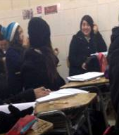 Dentro de la sala de clases esta opresión se manifiesta en la disposición espacial, que no favorece la comunicación a través de la LSCh. Los pupitres se distribuyen en filas, con lo que resulta imposible el intercambio comunicativo y el acceso a la LSCh tanto por parte de estudiantes Sordas como oyentes. Por otro lado, si bien existe una disposición y alto interés de los profesores y compañeras oyentes por aprender la LSCh, esta no constituye una vía de acceso fluida para los aprendizajes. Las clases se desarrollan con modalidad comunicativa bimodal,[1] que restringe la LSCh a la estructura de la lengua hablada. Frente a esta situación sería deseable contar con un intérprete en LSCh, pero el Liceo informa que no posee recursos económicos para su contratación.