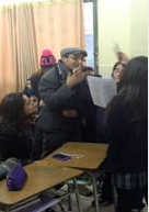 Figura 3. Conversación espontánea. Profesor retroalimenta trabajo de su estudiante Sorda mientras sus compañeras prestan atención a la conversación en Lengua de Señas.A pesar de lo anterior, el valor comunicativo de la LSCh se interrumpe cuando se trata del desarrollo de la clase. El profesor retoma la modalidad comunicativa bimodal (figura 4) y la clase transcurre de manera simultánea en Lengua de Señas y hablada, mientras las compañeras interactúan entre sí, utilizando LSCh (figura 5) o gestos espontáneos (según el nivel de dominio de cada una).