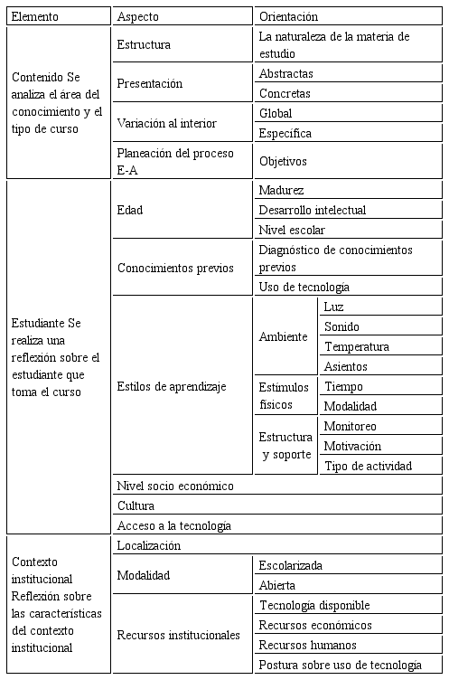 El otro aspecto tiene que ver con los factores inmersos durante el proceso de selección de tecnología (tabla 1), es decir, todos aquellos recursos educativos digitales (materiales, herramientas, dispositivos, servicios) que se utilizarán durante la conducción del proceso de enseñanza-aprendizaje con base en el contenido, el estudiante y la misma institución (Escamilla, 2005).