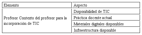 A reserva de los elementos mencionados por Escamilla (2005), la planeación estratégica de este trabajo también considera el contexto del profesor como otro componente (tabla 2) que contiene aspectos que influyen al momento de seleccionar la tecnología.