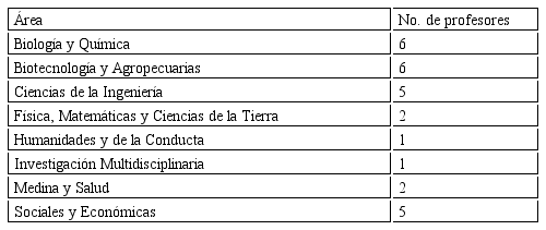 El estudio se realizó a partir de una convocatoria abierta al interior de la institución para todos los profesores dispuestos a mejorar su práctica docente a través de la incorporación de TIC. Se reunieron 28 profesores con las características descritas en el tabla 3; de estos, 16 son mujeres y 12 hombres, 8 profesores son hora clase y 20 de tiempo completo. Las áreas del conocimiento a las que pertenecen los profesores se muestran en el tabla 4.