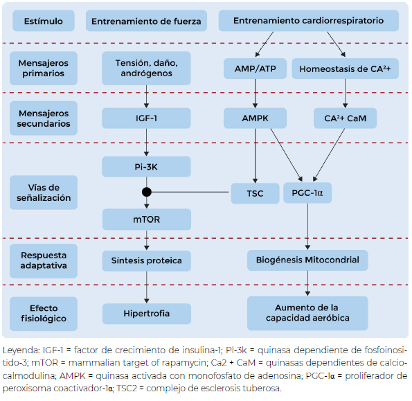 Vías de señalización molecular activadas en respuesta al entrenamiento de fuerza y entrenamiento cardiorrespiratorio.
