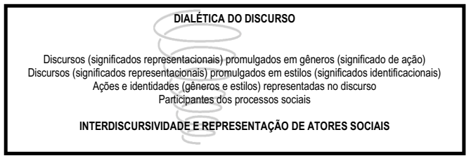 A Figura 1. Movimento dialético do discurso indica uma sincronia entre dialética e discurso, a construção dos significados representacionais em gêneros e estilos, que determinam as ações e identidades dos atores sociais. O movimento circular, representado pelo espiral, diz respeito à dimensão dialética do discurso. Assim, ao alcançar camadas mais profundas da análise tendendo ao ponto das categorias de análise adotadas na pesquisa, que é a interdiscursividade e a representação dos atores sociais, esses movimentos buscam estudar o fenômeno da língua através de um recorte, portanto, são diacrônicos e obedecem a uma determinada fase ou época da história (Pereira, 2017).