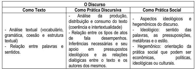 De acordo com Ramalho e Resende (2004), o modelo tridimensional de análise do discurso crítica, proposto por Fairclough, distingue três dimensões no discurso: o texto, prática discursiva e a prática social, podendo ser percebida na Figura 2. Modelo Tridimensional da ADC segundo Fairclough (2001).