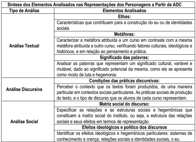 Com o intuito de responder a pergunta de pesquisa instaurada neste trabalho, buscou-se por meio da análise de discurso crítica, segundo Fairclough (1992), analisar as três dimensões do discurso, quais sejam: textual, discursiva e social, que estão superpostas na produção e consumo do texto pelos alunos participantes. Devido ao grande volume análises produzidas neste estudo, optou-se por inserir no corpo do texto desta seção uma sumarização realizada com base no quadro analítico indicado abaixo, contendo os elementos da tridimensionalidade da ADC (Fairclough, 1992; Pedrosa, 2005).