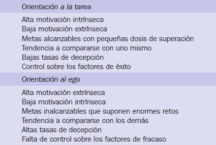 En la tabla 1 se reflejan las principales características de la orientación a la tarea y de la orientación al ego (Escartí & Cervelló, 1994;Cervelló, 1999; Cervello, Escartí, & Balagué, 1999):