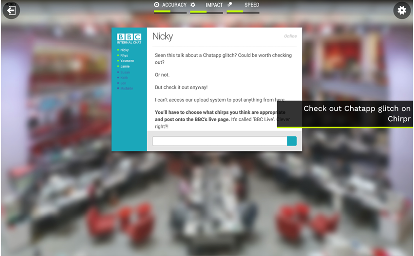 iReporter (BBC, 2018). In this format, the user takes on the role of a member of a team of journalists (the BBC Live Team), with the mission of maintaining a balance between accuracy, impact and speed during the coverage of a news crisis. The interactive uses a conversational navigation system in which the user must make decisions and interact with the different characters to advance the narrative and get to the point of refining the truth about what happened.