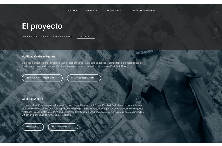 Guerra a la mentira (RTVE Lab, 2017). Interactive on the processes of verification of data from open sources. It includes three different episodes: the Omran case of a bombing of the civilian population, the case of Malasya Airlines flight MH17 shot down in Ukraine, and the case of the attack on a United Nations humanitarian convoy in Syria. They all follow a similar structure: an introductory video presents the facts, a simulated chat in which the user must interact with other characters, an interactive challenge, and the conclusion.