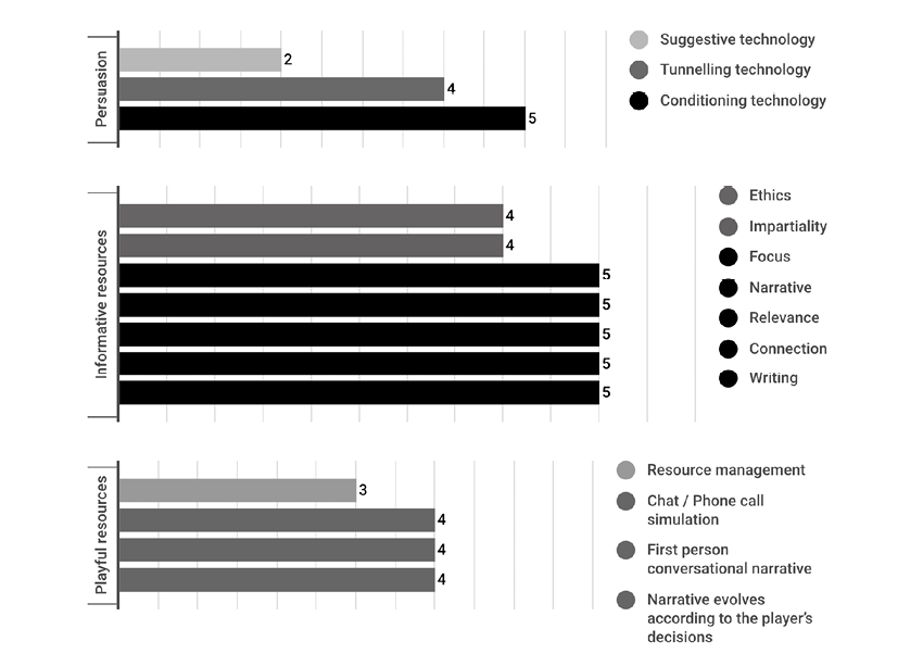 Despite the differences between both strategies, the five newsgames use similar persuasive, informative and playful resources (RQ2), as summarized in Table 2. From the point of view of persuasion, the most used strategy is operative conditioning, followed by tunnelled or guided narrative. All the newsgames use positive or negative reinforcement to strengthen behaviours. In addition, they use very simple narrative structures based on a predefined conversation with several response options. Although these are strategies that have proven to be very effective in modifying and influencing user behaviour (Fogg, 2003), from a realisation and design point of view they are not particularly innovative. It should be noted that all newsgames have a didactic and informative purpose. For this reason, in most cases, the informative and persuasive component carries more weight than the gameplay.