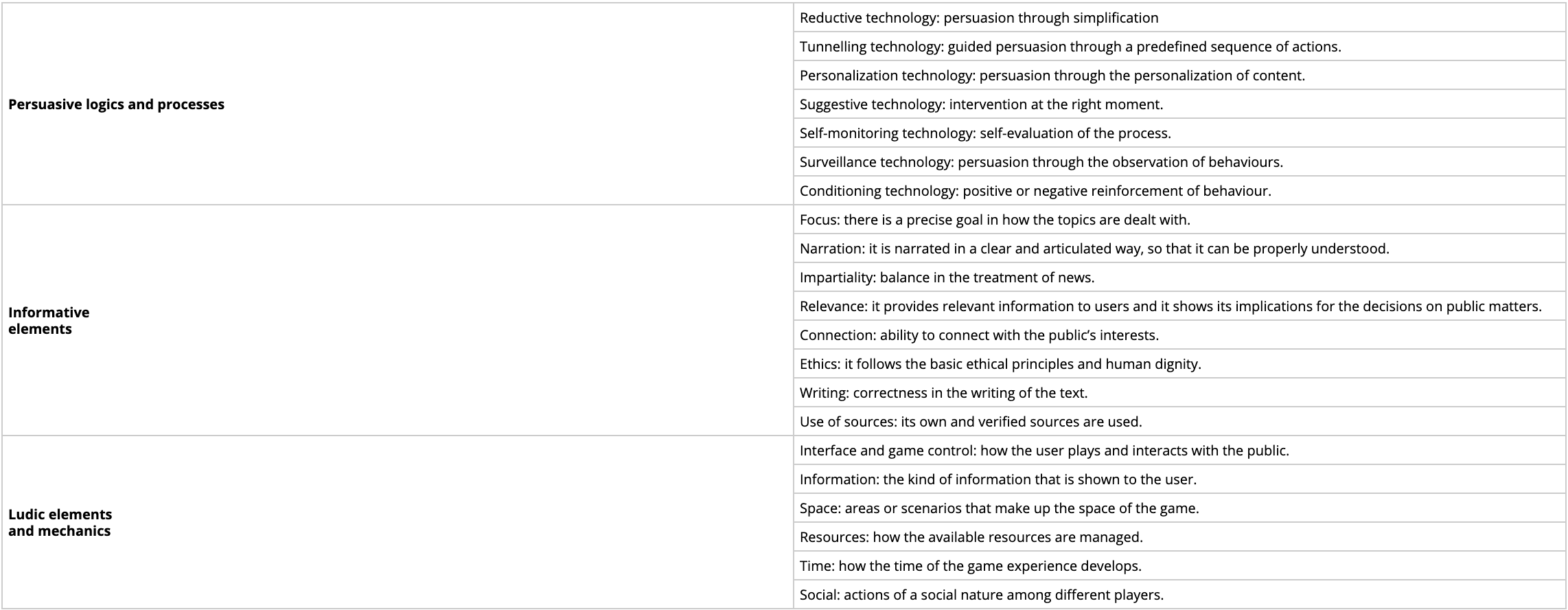 The research methodology is based on an exploratory analysis of the content, with the aim of identifying the mechanics, dynamics and narrative formulas used to show the verification processes. To carry out the analysis, a qualitative matrix was designed (Table 1) inspired by the works of García-Ortega and García-Avilés (2018), Planells (2015) and Fogg (2003). The analysis tool, which allows the journalistic and playful qualities of a newsgame to be measured, was tested in previous research (García-Ortega and García-Avilés, 2018). It also incorporates the catalogue of game mechanics established by Planells (2015) and the strategies and techniques of persuasion described by Fogg (2003).