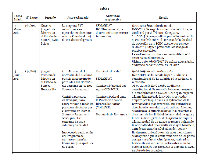 Los procedimientos que a continuación se analizan son los promovidos por los miembros de los Comités de Cuenca del Río Sonora. Los comités eligieron el juicio de amparo por considerar que los demás mecanismos son insuficientes, dado que los objetivos de tales procedimientos (civiles, penales, administrativos) versan sobre la aplicación de sanciones y el pago de indemnizaciones y no sobre cuestiones tendientes a la restauración, a la determinación de violaciones a derechos humanos y sobre todo, poco aportan para concretizar la garantía de no repetición. Al 31 de agosto de 2017 se encuentran vigentes 11 juicios de amparo, respecto a diversas temáticas; los primeros 8, se detallan en la tabla 1.