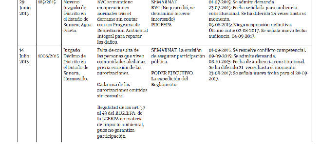Por tal razón, el acceso a la justicia ambiental debe incluir la disposición efectiva de la información técnica precisa y de la generación de espacios democráticos de participación y discusión pública de los proyectos ambientales sujetos a evaluación. No obstante, como se visibilizó en el asunto que nos ocupa, las comunidades aledañas al río Sonora han evidenciado, mediante diversos juicios de amparo,28 que han sido violados sus derechos relativos a que se les informe sobre los proyectos y ampliaciones de la empresa minera en la zona, violando su garantía de audiencia, de participación, de información, sin que hasta la fecha hayan sido resarcidos en tales prerrogativas.