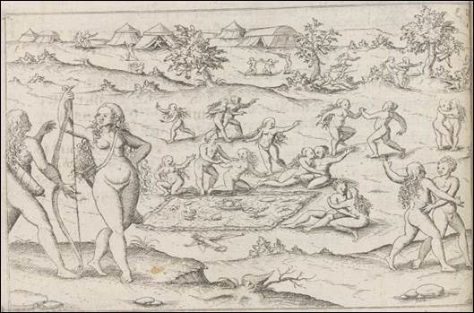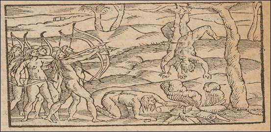 Ellas hacen la guerra cotidianamente contra cualquier nación: y tratan inhumanamente a aquellos que toman en guerra. Para hacerlos morir, los toman por una pierna y los cuelgan de un árbol […] y no se los comen como los otros salvajes, de tal manera que los pasan por fuego, hasta tal punto de reducirlos en cenizas […] y dan gritos maravillosos para espantar a sus enemigos (Thevet, 1558: 123).