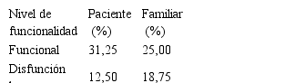 Para evaluar la funcionalidad familiar se utilizó el APGAR, compuesto por 5 componentes (adaptabilidad, participación, gradiente de recursos, afectividad y capacidad resolutiva)39, la escala se aplicó a 16 participantes (8 pacientes y 8 familiares), de los cuales 5 familiares tenían un vínculo conyugal (esposo) y 3 de consanguineidad (hijos); los resultados arrojaron que el 56,25% (9 participantes) perciben la familia como funcional; el 31,25% (5 participantes) perciben la familia con una disfunción leve y el 12,5% (2 participantes) perciben la familia con una disfunción grave (ver tabla 1).