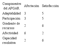 Por otra parte, según los componentes que evaluados por el APGAR, se evidencia que el más afectado es la afectividad, mientras que los más fuertes son la capacidad resolutiva y el gradiente de recursos. Puntuaciones bajas en el componente de afectividad indican que las relaciones de amor y atención entre los integrantes de la familia, se ha visto afectada por la enfermedad, debido a que los miembros de la familia no responden de manera adecuada a los sentimientos de rabia, tristeza o amor; lo que puede afectar el afrontamiento y el curso de la enfermedad; no obstante, los componentes con mayor satisfacción fueron el gradiente de recursos que se relaciona con el grado de maduración física, emocional y social, y la autorrealización de los miembros de la familia; puntuaciones altas en estos componentes indican que sus familiares adoptan una actitud activa, positiva, experiencial; que les permiten madurar como familia (ver tabla 2).