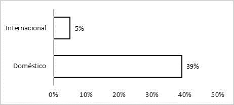 La información recabada permitió identificar que el 78,3% de las empresas encuestadas incluye uvilla en su cartera de negocios, ya sea en estado fresco o procesado. Solo el 21,7% de las empresas transforma uvilla en productos como jugos, pulpa, zumo, almíbares y deshidratada. Asimismo, se identificó que el 39,1% de las empresas registradas operan exclusivamente en el mercado doméstico de uvilla, el 5,0% exclusivamente en el mercado internacional; y el 55,9% ha participado en ambos tipos de mercado como se muestra en la Figura 4. Por otro lado, del 60,9% de empresas que ha tenido experiencia en mercados internacionales, solo el 30,4% ha exportado productos a base de uvilla con valor agregado.
