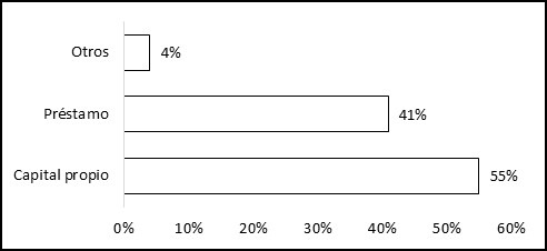 1) Factor socioeconómico.Esta etapa cuenta con productores entre los 30 y 50 años, en su mayoría son hombres (56,0%) pero la inclusión de mujeres se ha incrementado en un 5,0% en los últimos 3 años gracias al aumento progresivo del mercado de uvilla. La formación académica de sus agentes es secundaria (40,0%) y superior (26,0%). Un 28% de los productores son miembros de asociaciones y un 39,0% son socios de cooperativas. Con lo que respecta a sus fuentes de financiamiento, estas varían como lo muestra la Figura 5, donde es el capital propio el que mayormente interviene en la producción y lo que posiblemente impida un crecimiento económico rápido de este bien agroalimentario.
