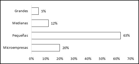 1) Factor socioeconómico. De las empresas registradas se identificó que más del 70% corresponde a Mipymes (micro y pequeñas empresas); asimismo, se identificó medianas y grandes empresas participando en la cadena de valor de la uvilla como lo muestra la Figura 6. El 64% de las empresas registradas son miembros de asociaciones y un 36% son socios de cooperativas.