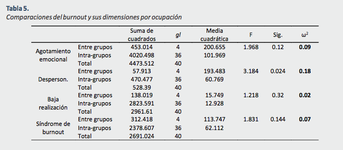 Al aplicar el análisis de varianza para comparar las dimensiones del síndrome de burnout en función de la ocupación de los cuidadores, se encontró una importancia práctica pequeña en despersonalización (ω2 =.02), mediana en agotamiento emocional (ω2 =.09) y síndrome de burnout (ω2 =.07), y grande en baja realización personal (ω2 =.18). De modo que los cuidadores profesionales son quienes presentan mayor baja realización personal, y quienes son cuidadores familiares y amas de casa, presentan mayor agotamiento emocional y puntajes más elevados en el síndrome de burnout (Tabla 5).