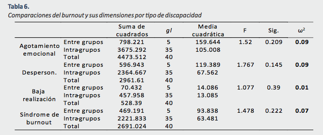 Las comparaciones en función del tipo de discapacidad de las personas que tienen a su cargo los cuidadores, indican que no existen diferencias significativas en ninguna de las dimensiones del síndrome de burnout (Tabla 6). Por otro lado, el análisis del tamaño del efecto indica que existe una importancia práctica pequeña al comparar la dimensión despersonalización (ω2 =.01), y mediana cuando se comparan las dimensiones agotamiento emocional (ω2 =.09), baja realización personal (ω2 =.09), y burnout en general (ω2 =.07).
