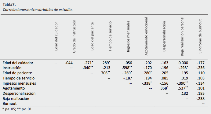 Se tiene que la edad del cuidador, se relaciona de manera baja y positiva con la edad del paciente, el tiempo que llevan dedicando a atenderlo y el agotamiento emocional, pero solo las dos primeras fueron significativas (p< .05). El grado de instrucción del cuidador se correlacionó de manera negativa con la edad del paciente, el tiempo de servicio, la baja realización personal y el síndrome de burnout. Asimismo, el grado de instrucción obtuvo correlaciones positivas, moderadas y significativas con los ingresos mensuales del cuidador (r= .598; p< .01). La edad del paciente se relacionó de manera positiva, fuerte y significativa con el tiempo de servicio (r= .706; p< .01), mientras que también obtuvo relaciones bajas y negativas con los ingresos del cuidador (r= -.269; p< .05), y positivas con el agotamiento emocional (r= .280; p< .05) y con la despersonalización, pero en este último caso, las relaciones no fueron significativas. Los ingresos mensuales se correlacionaron de manera negativa, moderada y significativa con el agotamiento emocional (r= -.338; p< .05) y la baja realización personal (r= -.390; p< .01). El agotamiento emocional se correlacionó de manera positiva, moderada y significativa con la despersonalización (r= -.358; p< .05) y la baja realización personal (r= -.537; p< .01). Finalmente, la baja realización personal se correlacionó de manera baja y negativa con el síndrome de burnout, pero dichas relaciones no fueron significativas.