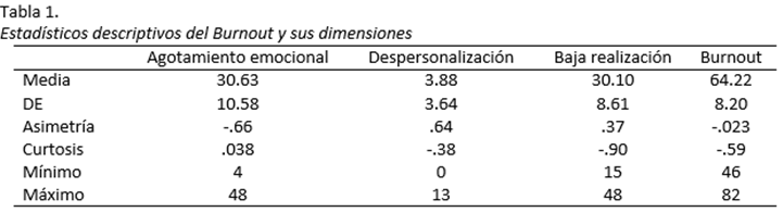 Los datos descriptivos se aprecian en la Tabla 1, donde se puede observar que el agotamiento emocional tiene una media del agotamiento emociona fue de 30.63 que implica un nivel severo, mientras que la despersonalización tiene una media de 3.88 que es leve, y la baja realización personal tiene una media de 30.10 que supone un nivel leve. El síndrome de burnout tiene una media de 64.22 que implica un nivel moderado del síndrome. Asimismo, la asimetría y la curtosis son bajas con tendencia a la derecha.
