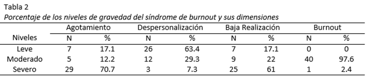 En la Tabla 2 se puede ver el porcentaje obtenido de los niveles de gravedad del síndrome de burnout y sus dimensiones, de modo que el 17.1% de los sujetos evaluados se ubica en un nivel leve de agotamiento emocional, el 12.2% en un nivel moderado y el 70.7% en un nivel severo. Con respecto a la despersonalización, el 63.4% se ubica en un nivel leve, el 29.3% en un nivel moderado y el 7.3% en un nivel severo. La baja realización personal, registra un 17.71% de sujetos con nivel leve, 22% con nivel moderado y 61% con nivel severo. Finalmente, en cuanto al síndrome de burnout, ninguno de los evaluados se ubica en el nivel leve, el 97.6% se ubica en nivel moderado, y el 2.4% se ubica en nivel severo.