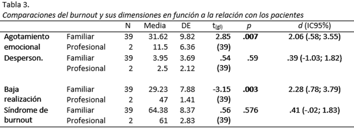 Al hacer comparaciones entre las dimensiones del síndrome de burnout y la puntación total, en función de si son familiares o profesionales, quienes atienden a las personas con discapacidad, se tiene que existen diferencias significativas en agotamiento emocional y baja realización personal. En el primer caso, son los cuidadores familiares quienes tienen mayor agotamiento emocional (t(39) = 2.85; p = .007) y en el segundo, son los cuidadores profesionales quienes tienen más baja realización personal (t(39) = -3.15; p = .003). En ambos casos, el análisis del tamaño del efecto permite observar una importancia práctica grande (d = 2.06 y d= 2.28 respectivamente) (Tabla 3).