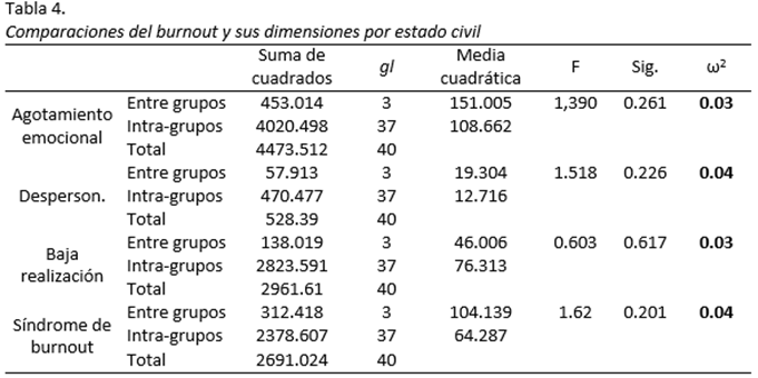 También se hicieron comparaciones en función del estado civil de los cuidadores, a través del análisis de varianza, pero no se registraron diferencias significativas, aunque el análisis del tamaño del efecto señala que las diferencias reportadas tienen una importancia práctica pequeña (ω2 > .01) (Tabla 4).