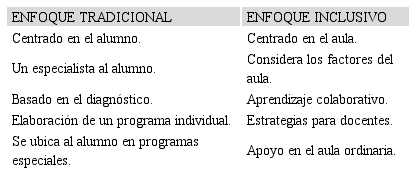 La educación inclusiva, corresponde con tradiciones pedagógicas donde la prioridad es resguardar la escuela y la enseñanza en base al currículo y enseñanza equitativa. En este sentido, integra claves sociológicas y culturales sin dejar de lado los aspectos metodológicos. A continuación, en la tabla 1, se presenta el diseño de elaboración propia el diseño del Enfoque de Educación Inclusiva, propuesto por Porter.