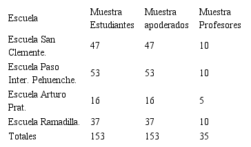 Seguidamente, se realizó una prueba Chi-cuadrado que corresponde a una distribución de probabilidad continua con un parámetro determinado que representa los grados de libertad de la variable aleatoria, de esta forma se determinó si las variables índices de inclusión y puntaje SIMCE están relacionadas. Distribución de la muestra: se aplican encuestas a Estudiantes, Apoderados y Profesores de cuatro establecimientos distribuidos de la siguiente manera.
