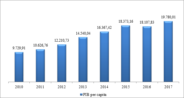 A evolução do PIB per capita de Porto Nacional acompanha, praticamente, a tendência de crescimento de suas atividades produtivas. Assim, no período de 2010 a 2017, esse PIB saiu de R$ 11.194 em 2010 para R$ 49.738 em 2017, o que representou um crescimento nominal de 344%, conforme Gráfico 9. Isso o colocou como o quarto maior PIB por habitante do Tocantins.