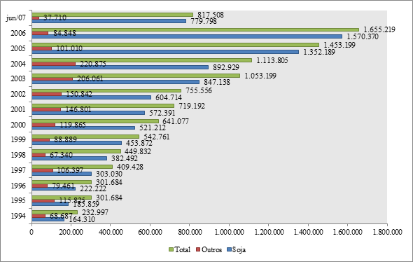 O Gráfico 10 evidencia a evolução da produção agropecuária de Porto Nacional, também faz parte desse intenso processo de expansão da fronteira agropecuária que vem ocorrendo nas regiões Centro-Oeste, Norte e Nordeste, principalmente com a criação de Empresas Brasileira de Pesquisa Agropecuária (Embrapa) em 1973. A expansão agrícola na região é feita com destaque para a produção de soja, incorporando áreas do bioma do Cerrado com a utilização de técnicas de calagem que tem transformado o solo ácido em terras aráveis e produtivas para a expansão da agricultura. Com isso, a soja tem se tornado um produto mais rentável, estimulando a produção no município e fazendo parte de sua pauta de exportação.