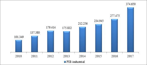 Assim como a agropecuária, a indústria também cumpre papel de destaque na economia do município, conforme Gráfico 11. Há uma trajetória crescente de industrialização no município com possibilidade de aproveitamento de um pátio da FNS para aproveitamento de insumos que venham da agropecuária para se industrializar. O município viu seu PIB industrial crescer de R$ 101 milhões em 2010 para R$ 374 milhões em 2017, o que significou um incremento nominal de 270% no período.