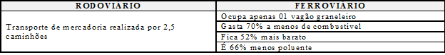 O Quadro 1 apresenta uma comparação entre os modais rodoviário e ferroviário, e a vantagem deste último sobre o primeiro com relação a alguns quesitos. O que se percebe é que os custos de transporte ferroviário são menores, gastam menos combustível, poluem menos, capacidade alta de carga. Do ponto de vista econômico, isto vai ter uma relevância no preço final do produto, uma vantagem competitiva.