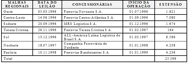 O marco importante do processo de privatização de vias terrestres ocorreu em 1992, com a transferência de uma significativa parte da malha ferroviária brasileira para a iniciativa privada, por um período de 30 anos, com possibilidade de ser prorrogado por mais 30 anos, como mostra o Quadro 3.