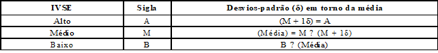 Com o intuito de classificar a vulnerabilidade socioeconômica em grupos, empregou-se a denominação recomendada por Melo e Parré (2007) e Xerxenevsky e Fochezatto (2015), a partir do valor médio do índice. A escala utilizada é relativa, tendo seus valores baseados na média. Foram classificados com IVSE, alto (A), os municípios com valores acima da média mais um desvio-padrão; intermediário (M), os municípios que apresentaram resultados entre a média e um desvio- padrão acima da média, e baixo (B), os municípios com valores abaixo da média. A interpretação do IVSE é que, quanto maior o seu valor, maior é o nível de vulnerabilidade socioeconômica do recorte geográfico analisado. Essa classificação está exposta no Quadro 2.