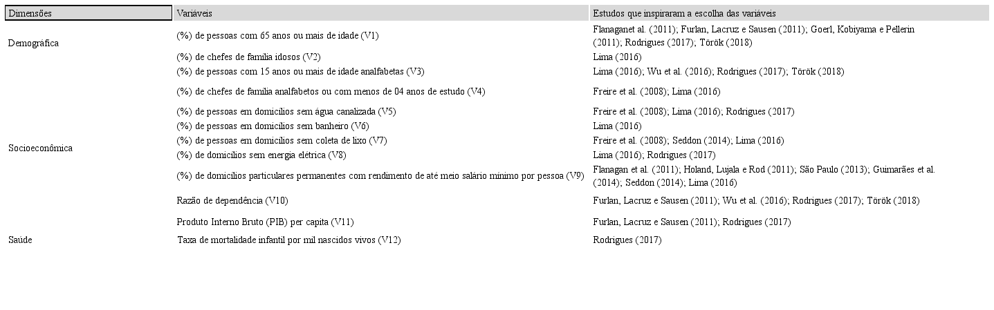 Para a dimensão demográfica, elencam-se as variáveis que refletem à ausência da População em Idade Ativa (PIA) como indicativo de vulnerabilidade socioeconômica, a exemplo da participação de pessoas com 65 anos ou mais de idade e porcentagem de chefes de família idosos. Nessa perspectiva, Araújo (2017) e Felix (2014) destacam que apesar das mudanças do perfil etário da população brasileira, com acentuado crescimento no número de idosos, tal contingente populacional é caracterizado por uma mobilidade socioeconômica mais limitada, dada a relativa perda das habilidades conectivas e a dificuldade em encontrar postos de trabalho, menos intensivos em trabalho, compatíveis com suas características potenciais.