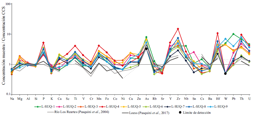 Las concentraciones de elementos traza y ETR en las muestras de sedimento son variables (Tabla A1 del suplemento electrónico). Con el fin de analizar su distribución y variabilidad geoquímica a lo largo del curso medio del río Suquía, las concentraciones absolutas fueron normalizadas al valor promedio de la CCS y se representaron mediante diagramas multielementales. La Figura 3 exhibe los resultados obtenidos, donde se incluye además un promedio composicional para muestras de loess (Pasquini et al., 2017) y la composición normalizada de sedimentos de fondo de ríos de regiones prístinas de las Sierras de Córdoba (Pasquini et al., 2004). En esta figura se observa que la composición de los sedimentos del río Suquía exhibe diferencias importantes con aquella propia de la CCS, del loess y de los sedimentos de áreas prístinas, presentando, en general, mayores concentraciones de elementos traza y ETR. En relación a los elementos mayores, el Si y el Al presentan concentraciones similares a las de la CCS. El Fe, Mn, Ti y P muestran concentraciones más elevadas, mientras que el Na y el K se encuentran deprimidos en todas las muestras. El Ca y el Mg muestran mayor variabilidad a lo largo del curso del río. En cuanto a los elementos traza, los que muestran las concentraciones normalizadas más elevadas son As, Y, Zr, Nb, Hf, Th y U. Entre éstos, el As presenta una anomalía positiva que alcanza, en algunos casos, hasta un orden de magnitud superior a los valores de la CCS, mientras que el Sr y Ba muestran concentraciones normalizadas más bajas. Por otro lado, los sedimentos del río Suquía aquí analizados exhiben mayores concentraciones que la de los sedimentos representativos de áreas prístinas y del loess regional.