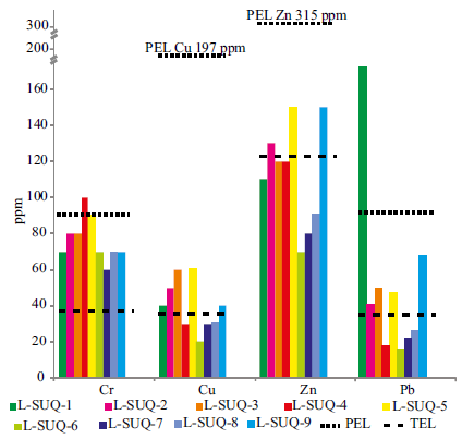 Por otra parte, las concentraciones de metales en los sedimentos estudiados fueron comparadas con las cantidades recomendadas en la guía interina canadiense de calidad de sedimentos (Interine Sediment Quality Guidelines, ISQGs) desarrolladas por el Canadian Council of Ministers of the Environment (CCME 2001). En la Figura 4 se observan las concentraciones de algunos elementos analizados y sus relaciones con los valores PEL (por sus siglas en inglés probable effect level), por encima del cual se espera que ocurran con frecuencia efectos biológicos adversos. También, se muestran los valores TEL (por sus siglas en inglés threshold effect level), equivalentes al ISQG, por debajo del cual, rara vez se espera que ocurran efectos biológicos adversos. Se observa que el Cr y el Pb son los únicos elementos que superan el límite PEL en zonas cercanas a las canteras y al lago (L-SUQ-4 y L-SUQ-1 respectivamente). Debido a la concentración de estos elementos, se espera que, con frecuencia, ocurran efectos adversos en el ecosistema. En general, en el resto de la región las concentraciones se encuentran entre los límites guías, pudiendo ocurrir efectos adversos ocasionalmente.