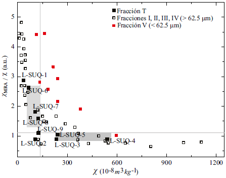 En la Figura 7 se representa la relación entre parámetros dependientes del tamaño de grano magnético (cociente anhistérico χMRA/χ) y la concentración magnética (χ). Las correlaciones entre estos parámetros son estadísticamente significativas, aunque son mayores para la fracción más fina V (r = -0.81; ρ < 0.01). Si bien no se observaron valores de χMRA/χ > 5 indicativos de minerales ferrimagnéticos muy finos < 0.1 µm (Peters y Dekkers, 2003); los valores más altos de χMRA/χ (esto es, granos magnéticos más finos) en las muestras totales, se observan principalmente en zonas urbanas (L-SUQ-6, L-SUQ-7 y L-SUQ-8, Figura 7). La fracción granulométrica V para cada sitio presenta, en general, valores mayores respecto a la muestra total.