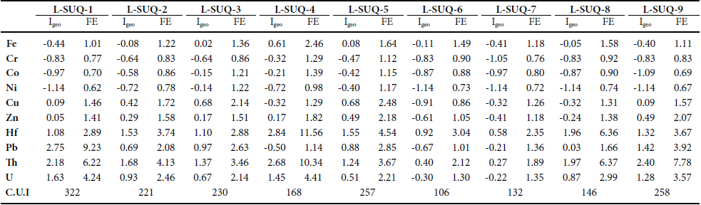 Los índices de contaminación de sedimentos calculados en este trabajo se presentan en la Tabla 1. Del análisis de estos índices (Igeo y FE) se observa que los sedimentos del río Suquía evidencian grados de contaminación variable, desde no contaminados (Igeo < 0; FE < 1) hasta contaminación moderada a alta (Igeo > 2; FE > 5). Claramente se observa que en la zona urbana (L-SUQ-6 y L-SUQ-7) existe baja contaminación, excepto para los elementos Hf y Th. Estos elementos, junto con el U y el Pb son los que producen mayor contaminación en los sedimentos a lo largo de la cuenca, alcanzando un grado alto y significativo de ambos índices. La zona rural (L-SUQ-9) evidencia un gran número de metales con índices de contaminación altos, especialmente para los elementos antes mencionados. Por otro lado, los elementos Fe, Cr, Cu, Co, Ni y Zn presentan valores de Igeo < 0 en su mayoría, lo que indica que los sedimentos no presentan contaminación de estos elementos en el área estudiada.