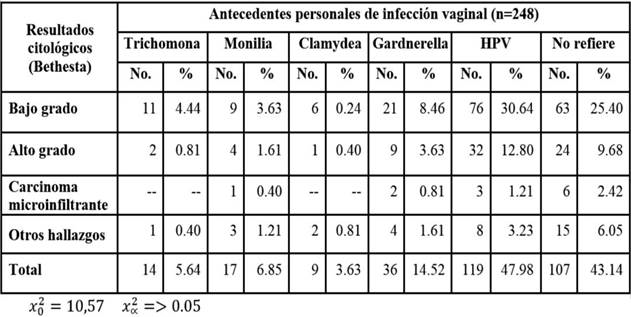 La citología arrojó un predominio de las lesiones de bajo grado para un 64.91 % de la muestra en estudio; al igual que las pacientes con antecedentes de HPV (47.98 %). En relación con los casos de carcinoma microinfiltrante diagnosticados, se observó que preponderaron en mujeres en las que no se reportaron infecciones (tabla 1). La prueba estadística Chi Cuadrado permitió establecer que las variables resultados citológicos y antecedentes personales de infección vaginal fueron independientes entre sí.