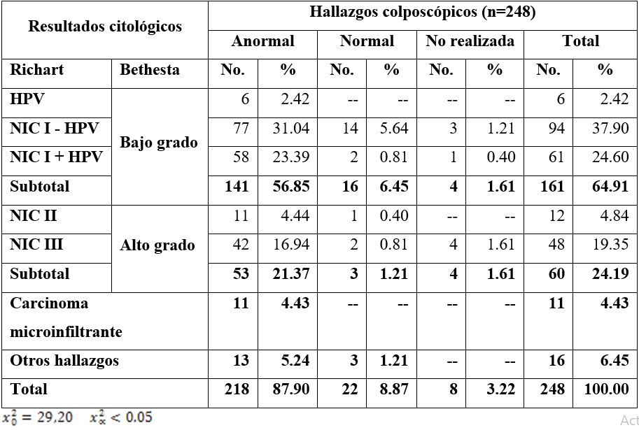 A más del 95% de las pacientes muestreadas se le practicó el estudio diagnóstico relacionado con las patologías de cuello con empleo del colposcopio. En el 100% de los casos de carcinoma invasor según citología se obtuvo una colposcopía anormal (tabla 2). En las lesiones de alto grado se obtuvo una mayor correspondencia entre los resultados de los dos métodos diagnósticos aplicados; los que resultaron significativamente dependientes.