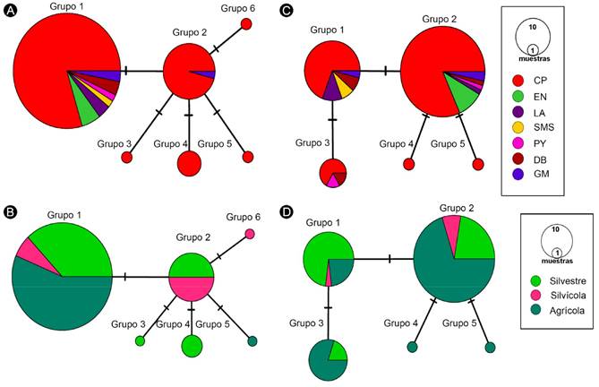 De las 156 secuencias analizadas se identificaron 38 haplotipos diferentes para el marcador trnS-trnG, 20 pertenecientes a S. purpurea, 12 a S. mombin (en sus variedades mombin y globosa), dos a S. radlkoferi y tres a S. testudinis (Cuadro 1). Los haplotipos se agruparon en seis grupos en la red anidada de las especies de Spondias (Figs. 1A, C). El grupo 1 contiene 80% de las secuencias: los 17 haplotipos asignados de manera exclusiva a Spondias purpurea, tres haplotipos en los que están representados S. purpurea y S. mombin var. mombin, uno con S. purpurea y S. radlkoferi y uno con S. mombin var. mombin y S. testudinis (Cuadro 1). Este grupo se distribuye en las poblaciones 1-2, 5, 9-10, 12-14, 16, 18-21, 24-31, 34-42, 44-54 y en todas las provincias biogeográficas y en las poblaciones de Brasil (Cuadro 2, Fig. 1A); 58% de los ejemplares que pertenecen a este grupo tienen manejo agrícola, 35% provienen de poblaciones silvestres y 7% tienen manejo silvícola (Fig. 1B). Esta información sugiere que este grupo de haplotipos ha sido sometido a un proceso de domesticación y que no hay una asociación entre los diferentes haplotipos que le integran y la distribución geográfica de estos linajes.