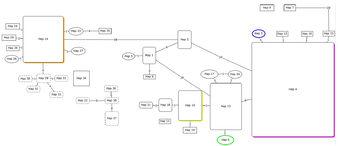 El análisis filogeográfico para examinar las relaciones entre las áreas de distribución y los linajes genéticos de S. purpurea y sus especies hermanas se realizó obteniendo una red de haplotipos (Schaal et al., 1998; Avise, 2000). La red de haplotipos se obtuvo con la ayuda del programa TCS 1.21 (Clement et al., 2000) uniéndolos a todos hasta con un máximo de 70 diferencias. Los análisis de contingencia anidada para agrupar a los haplotipos (Templeton y Singt, 1993) se realizaron con el programa PopArt 1 (2014) en el módulo TCS. Se examinó la frecuencia de los diferentes haplotipos por especie y por poblaciones, así como tipo de manejo para cada grupo, con el fin de reconstruir la historia de los linajes genéticos de las cuatro especies de Spondias y para S. purpurea por separado.