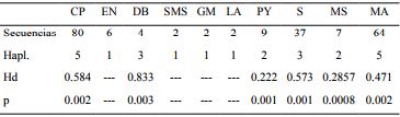 La provincia biogeográfica con una mayor diver-sidad de haplotipos y nucleotídica fue la Depresión del Balsas, seguida de la Costa del Pacífico y la Península de Yucatán. Las menos diversas fueron el Eje Neovolcánico, la Sierra Madre del Sur, el Golfo de México y Los Altos de Chiapas. Estas últimas contienen un solo haplotipo (Cuadro 3). Aunque se espera que la estimación de la diversidad genética esté subestimada para las provincias biogeográficas por la falta de un muestreo sistemático en algunas de ellas, los estimadores que se obtuvieron en este trabajo nos sugieren que en varias provincias existe una mayor diversificación de esta especie que en otras.
